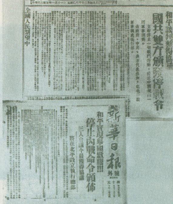 ↑1946年1月10日,《解放日报》和《新华日报》关于国共双方颁布停战令的报道。